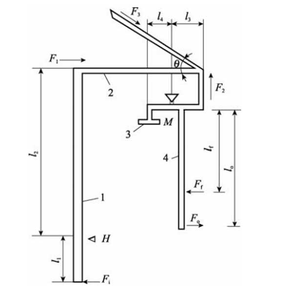 主、副杠杆和矢量机构的受力分析图如图3 所示。输入力 Fi 、检测元件膜片或膜盒的有效面积 A 与被测压力 Δp 之间的关系为